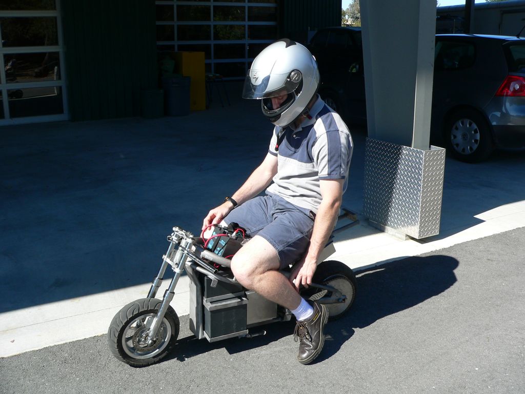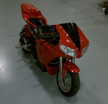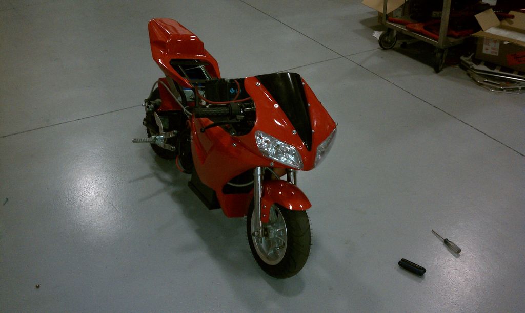 A team of three students recognized that the "Pocket Rocket", a small and inexpensive toy motorcycle platform, would be an interesting electrification challenge, and that an electric Pocket Rocket would enjoy many advantages over its petrol cousins. The team obtained an old bike with a burnt out engine and rebuilt the vehicle around a 19hp peak brushed electric motor. In order to fit the 1.5kWh battery pack in the tiny vehicle body the team made frame modifications before repainting and reassembling the vehicle with a quality of finish that makes it almost indistinguishable from an off-the-shelf pocket motorcycle.