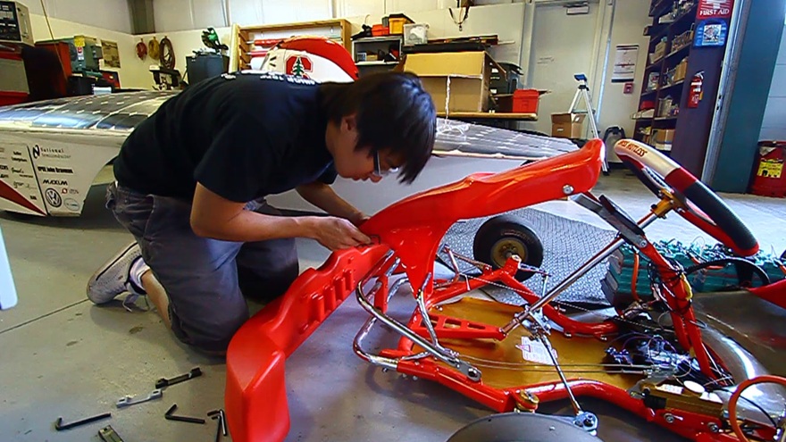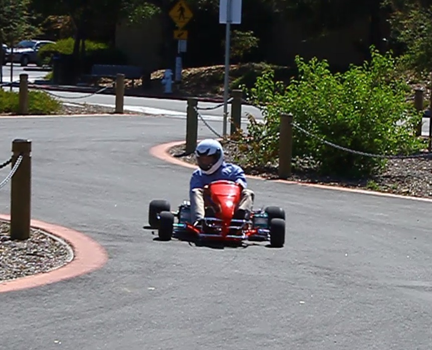 The group had the vision to create an electric vehicle with truly exciting performance characteristics and therefore decided to electrify a racing kart. The students acquired a gasoline powered go-kart and converted it into an electric version with a motor of close to 10HP. With the challenge to integrate all necessary electric / electronics and mechanical modifications into the existing layout of the vehicle, some basic vehicle dynamics problems surfaced as well. For instance with all the batteries in the rear, the resulting weight distribution compromised the steering capabilities.