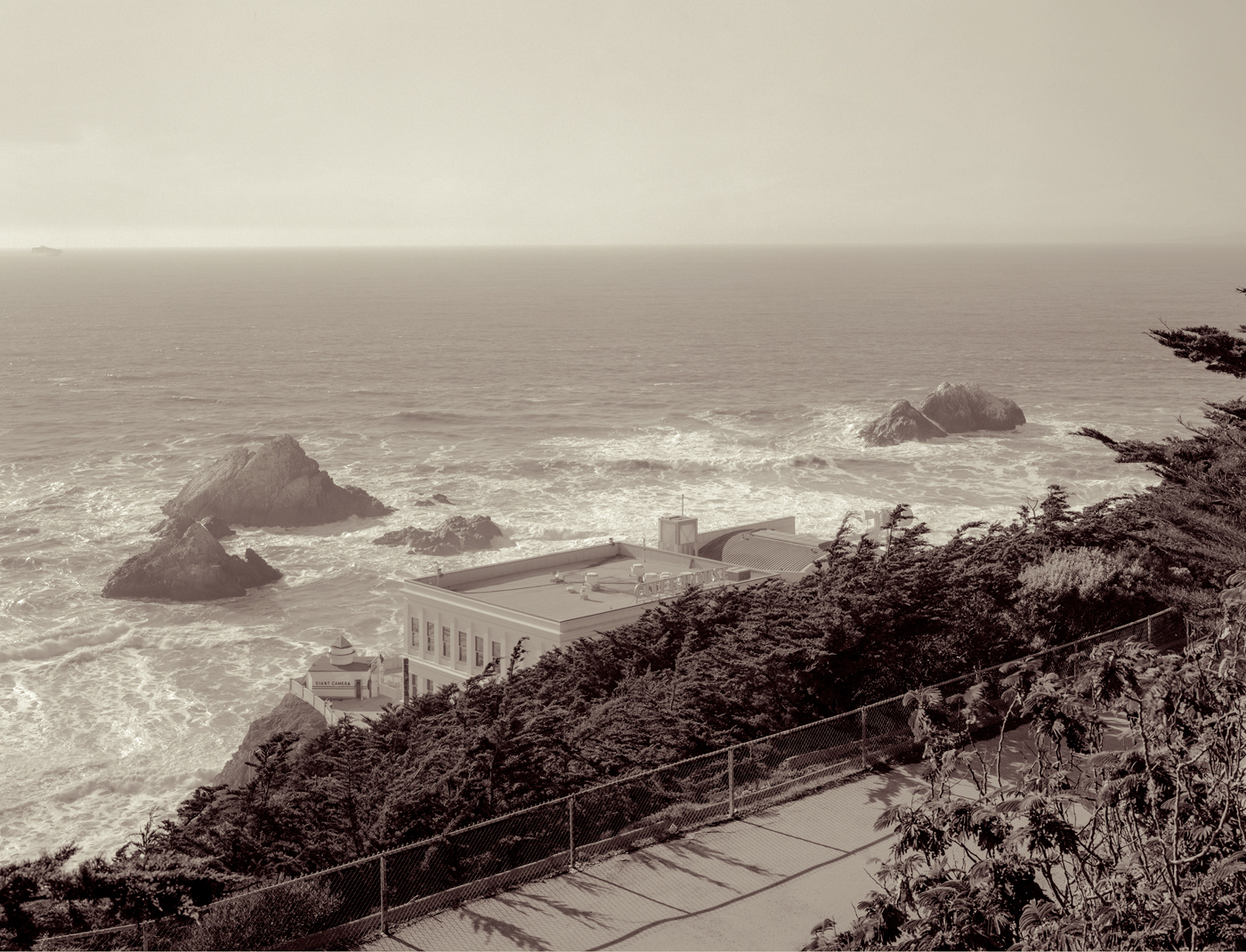 Of all the Watkins photographs we restaged, we experienced the greatest change in the landscape in the view of Alcatraz Island from North Point. Although you can see the shape of Angel Island in both pictures, the profile of Alcatraz is markedly different. In order to see the island and its famous prison building clearly, we had to place the camera at the end of Pier 39, which opened only in 1978, half a mile further into the bay than the historic North Point where Watkins took his picture.