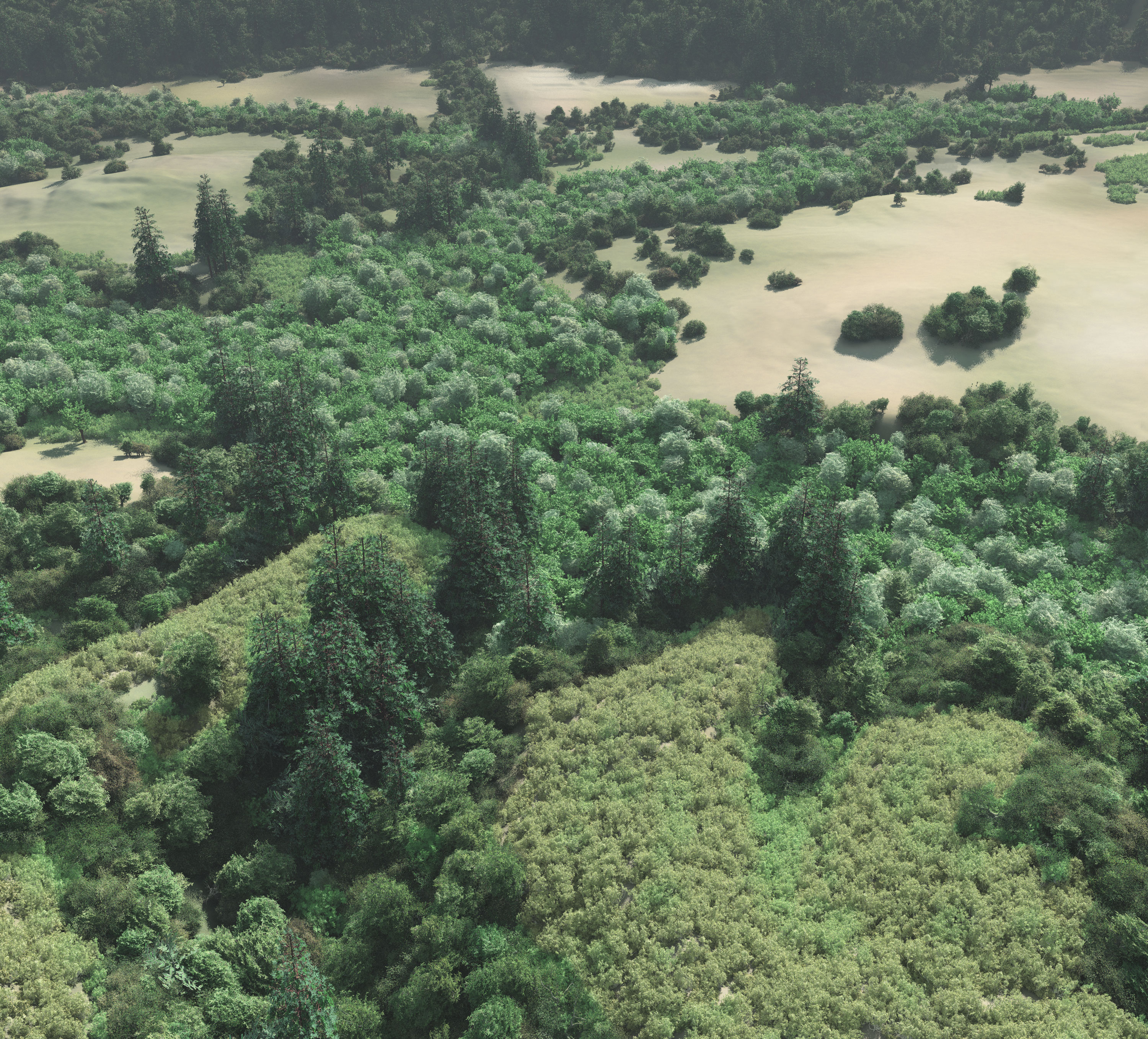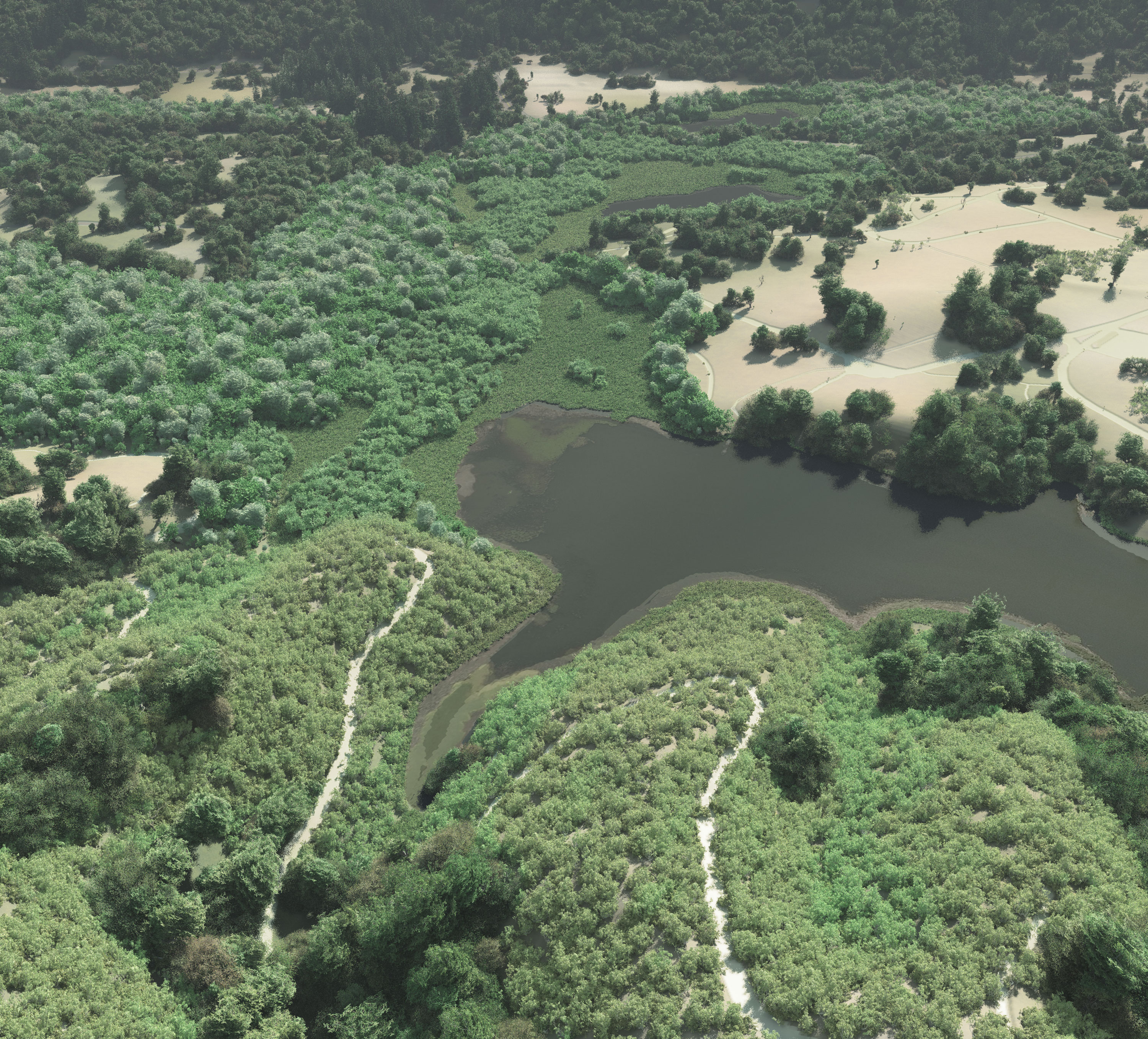 Final renderings were created using VUE by e-on software, a natural landscape 3D rendering program with a procedural tree species library. We were able to acquire digital models for relevant tree species (e.g. live oak, coast redwood) that follow detailed rules for tree form to produce a realistic landscape rendering where no two trees are identical. As a 3D model, the landscape could then be rendered from any angle and at a very high resolution (the tree models include individual leaves, for example).