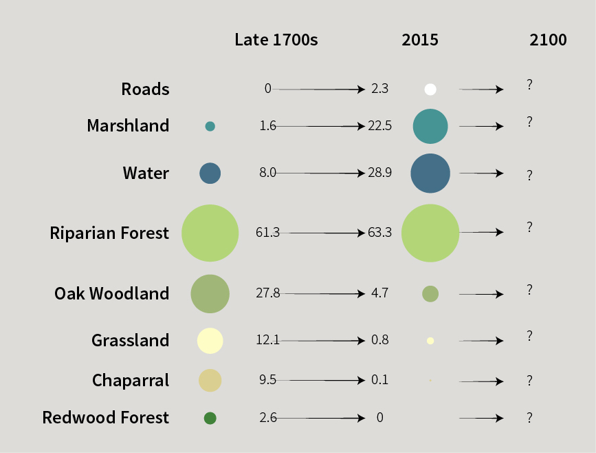 This project investigates the historical ecology of the San Francisquito Creek watershed and reconstructs a bird’s eye view the landscape as it may have looked before the area was settled by Europeans (circa late 1700s). The purpose of the study is to provide information for future restoration discussions, to improve our understanding of what the area looked like, and how the ecosystem functioned prior to major human settlement. The primary outcome of our study is a landscape reconstruction - a visual synthesis of our best understanding of the historical landscape drawn from historical evidence, expert advice, and GIS analysis. The precise extents of redwoods, oaks, and other vegetation classes are exceedingly difficult to determine. The maps here show a “best informed guess” estimate of the extent, size, and density of these vegetation classes based on environmental suitability modeling informed by historical assumptions (described on the far right). Further research is necessary to validate the model assumptions, make informed adjustments to the extents of each vegetation class, and refine the visual depiction of historical conditions in specific areas of interest.
