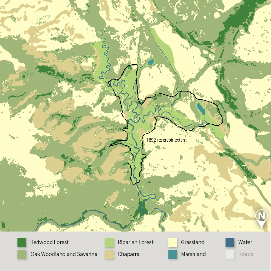 Our analysis focused on describing the historical hydrologic and topographic conditions and the extent, size, and density of six major vegetation types (redwood forest, oak woodland and savannah, riparian forest, grassland, chaparral and marshland) common in the Santa Cruz Mountains. While we have detailed survey data prior to the dam construction that describes the hydrology and topography of the study area, our knowledge of vegetation is mostly based on written accounts and is spatially imprecise.