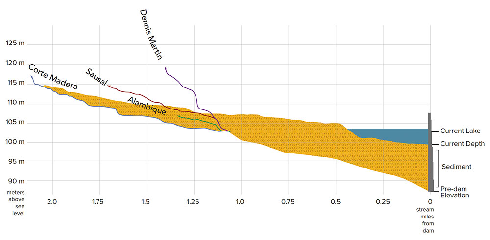 A detailed topographic survey of the study area performed before dam construction began in 1891 reveals some clues that the historical streams were mostly free-flowing with moderate gradient profiles.Sediment deposition over centuries led to the establishment of a flat-bottomed canyon under the area of the current lake extending up Corte Madera Creek. These meandering channels would have likely supported a wide riparian zone along the current and historical stream tributaries.