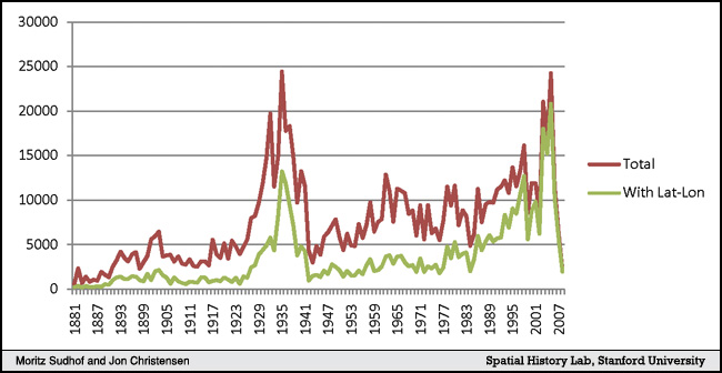 This website is no longer updated and has been replaced with a static copy. The Spatial History Project was active at Stanford University from 2007-2022, engaging in dozens of collaborative projects led by faculty, staff, graduate students, post-docs, visiting scholars and others at Stanford and beyond. More than 150 undergraduate students from more than a dozen disciplines contributed to these projects. In addition to a robust intellectual exchange built through these partnerships, research outputs included major monographs, edited volumes, journal articles, museum exhibitions, digital articles, robust websites, and dozens of lightweight interactive visualizations, mostly developed with Adobe Flash (now defunct). While most of those publications live on in other forms, the content exclusive to this website is preserved in good faith through this static version of the site. Flash-based content is partially available in emulated form using the Ruffle emulator.