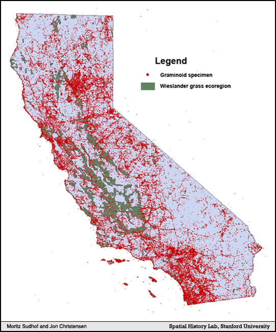 The green regions represent the Wieslander ecoregions considered to be grasslands, and each red dot represents a botanical grass specimen. The two images certainly do not tell the same story of grass growth in California. Wieslander’s ecoregions generalize areas by a set of characteristic vegetation; botanical collections are interested instead in specific plants and therefore embrace regional diversity. Each is precise in its own way, but neither accurately represents the character of the natural world around us.