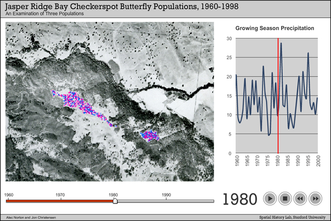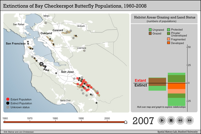 Using field records of lepidopterists, scientific publications, natural history museum specimens, environmental impact statements, and federal records associated with the Endangered Species Act, I have constructed a comparative history of more than 50 populations of the Bay checkerspot since the early 1960s. Using a Geographic Information System database and visualization software programs designed by the Spatial History Lab at Stanford, I have analyzed and shown that two-thirds of the populations have gone extinct during this period. But while half of those populations have disappeared because their habitat was developed, the other half disappeared in parks and protected areas. The most likely cause of their demise is habitat change. And the most likely cause of habitat change was removal of grazing. Bay checkerspot populations survive on private lands that continue to be grazed.