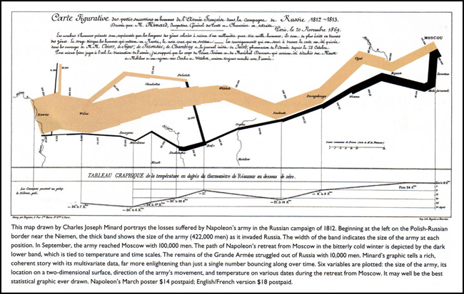 9 Charles Joseph Minard. Carte figurative des pertes successives en hommes de l’Armee Francaise dans la campagne de Russie 1812-1813. 1869. http://www.edwardtufte.com/tufte/posters.