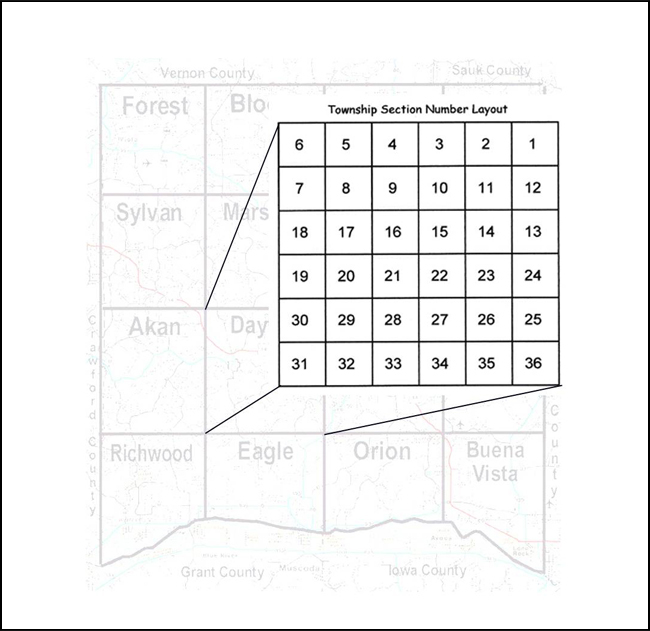4 Township Section Guide, as explained by rootsweb, http://freepages.genealogy.rootsweb.ancestry.com/~djnsl/SectionGuide.html.