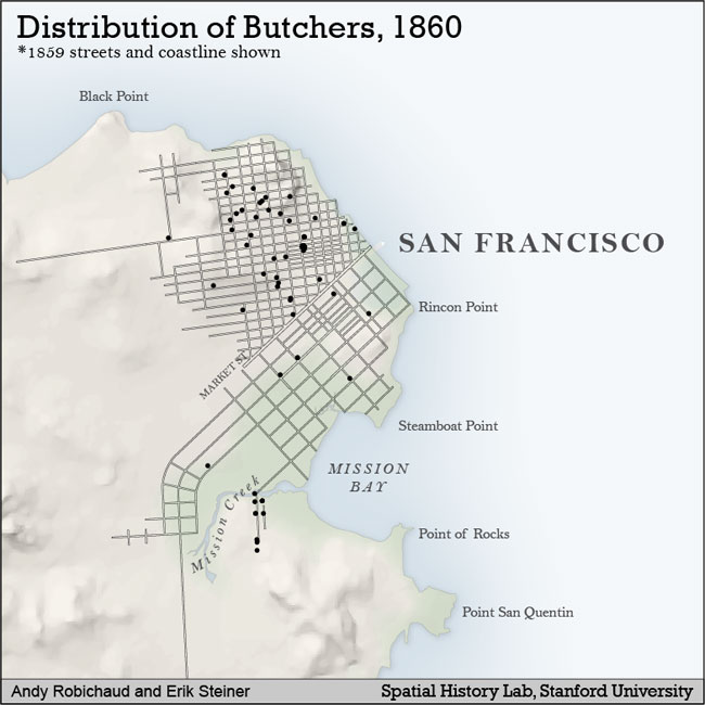 29 On a separate note, butcher shops might stand as a highly accurate proxy for settlement, since people did not travel far to buy meat. Since we do not yet have mapped population data for San Francisco in the nineteenth century, butcher shops may offer a decent place marker.