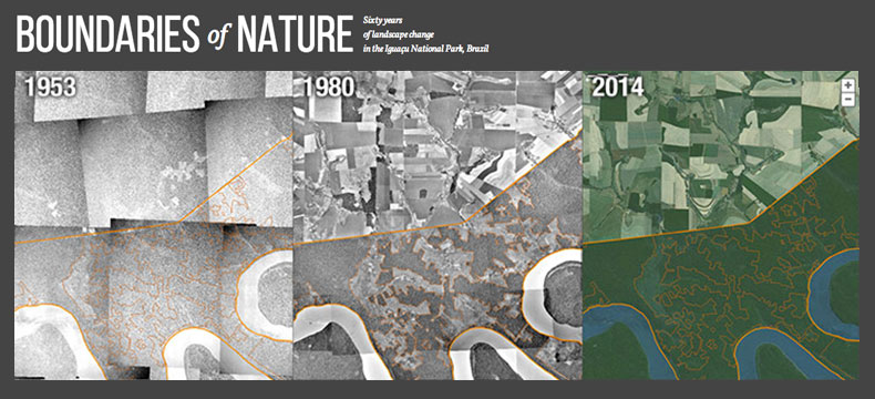 O Parque Nacional do Iguaçu foi criado pelo governo brasileiro entre 1939 e 1944 na fronteira com a Argentina. A criação do parque foi contestada pelo governo do Paraná, que, a partir do final da década de 50, começou a incentivar a colonização da região. Isto resultou em um conflituoso processo de remoção e reassentamento promovido pela ditadura militar nos anos 70. A confluência de colonos e diferentes níveis governamentais deixou marcas na paisagem do parque. Esta é uma história que demanda a conjunção de texto e imagem para uma melhor compreensão. Apresentamos uma visualização interativa que conta esta história. Esta visualização baseia-se em dois conjuntos de fotografias aéreas históricas da região produzidas pelo governo do Paraná. Ela oferece uma narrativa espacial diacrônica do papel da política ambiental na criação e preservação da natureza.