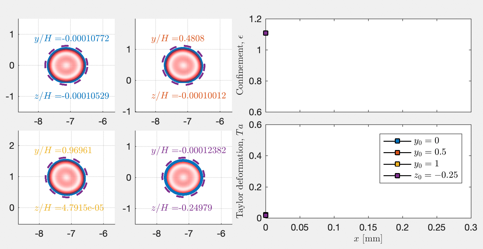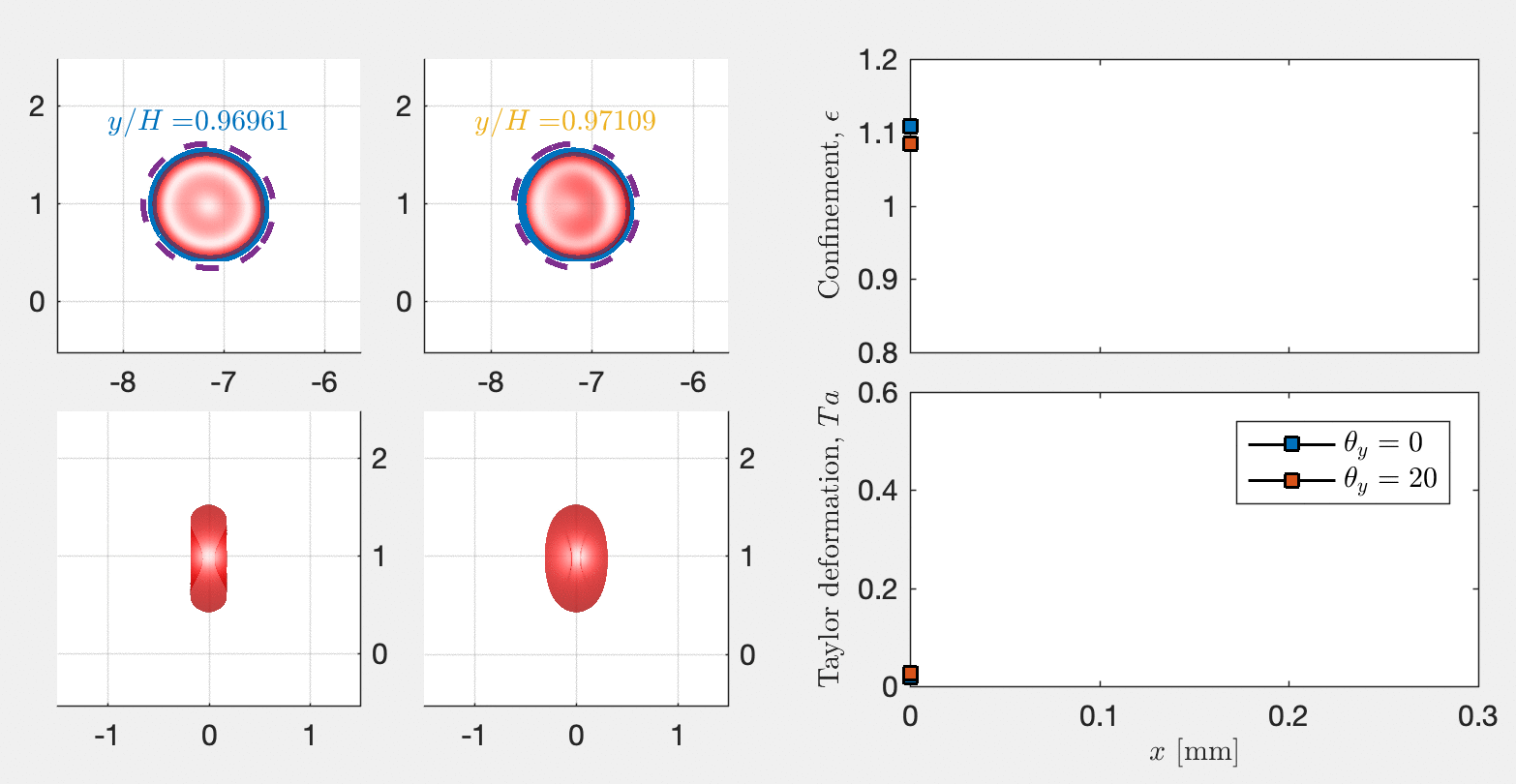 The simulations were conducted to evaluate the impact of initial condition, and to find the steady-state shape, respectively. We utilized the steady-state shapes to generate a surface for data interpretation relating the three important non-dimensional parameters: the Taylor deformation, the confinement, and the capillary number (based on cell velocity).