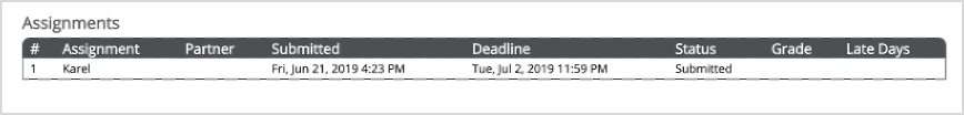 Figure 4: After submitting the assignment, the resulting page lists all of the assignments for which you have a submission, along with information about your submissions. The picture above shows what your page will look like after submitting Assignment 1.