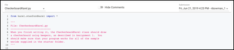 You should upload all of the appropriate files for the chosen assignment. The end of each assignment handout has a list of all of the files that we expect you to submit. You will not be able to hit the "Submit Assignment" button until you have uploaded all of the necessary files. Once they have been uploaded, your page should look similar to Figure 3. (Note that the specific list of files you'll be submitting for Assignment 1 have some different names than the files listed in the picture below—notably, you won't have GardenKarel.py, SquareKarel.py, or TripleKarel.py files in your submission).