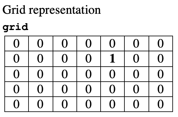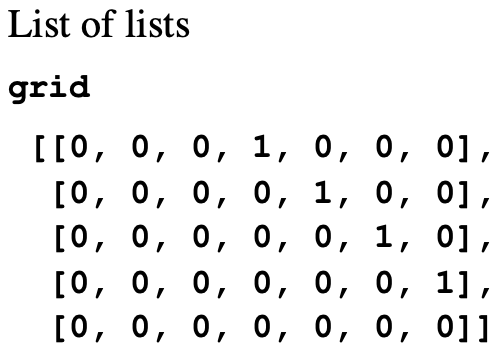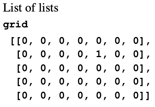 Say we have a 2-dimensional list (a list of lists) of integers, which we'll refer to as a variable named grid, that contains 0 in every element, except for one element, which contains a 1. Such a grid is shown below (first as a list of lists and then represented as a grid). Note the single 1 (which is bold-faced in the grid for clarity), which is in the second row, fifth column of the grid – that would be position grid[1][4].