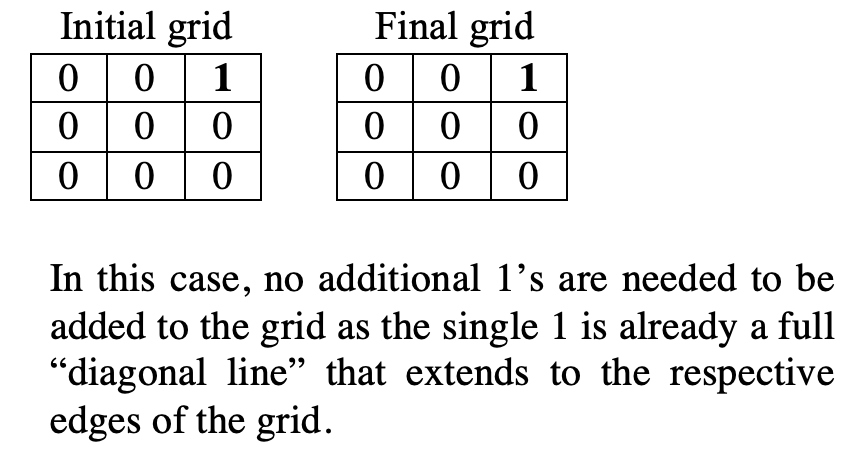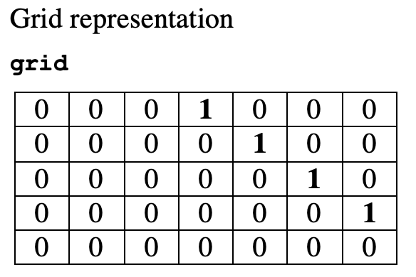 We would like to create a diagonal line of 1's (going down and to the right) through the grid, which includes the initial 1 in the grid and extends to the edges (but, obviously does not go outside) of the grid. So, starting with the grid above, we would end up with the following final grid, showing both the list of lists and grid representations (again, the 1's in the grid are bold-faced for clarity):