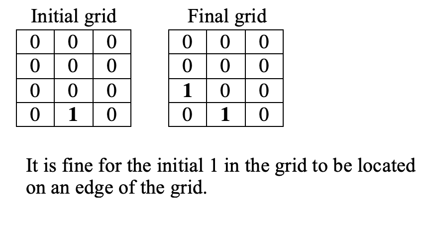The initial grid we are given can have any number of rows and columns (but it will be guaranteed to have at least one of each). You can assume that every element in the grid you are given, except for one, contains 0's and the remaining element has a 1. Your task in this problem is to write a function: