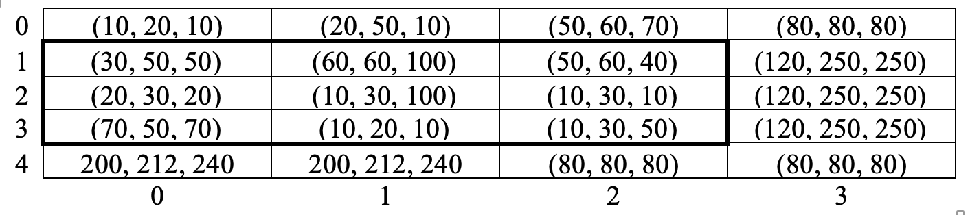 As we talked about in class, an image is just a grid of pixels. There are many applications (such as techniques to blur an image) that require us to compute average values over subsections of such an image. Specifically, if we are given an image, we want to compute a new** image of the same size where each pixel in the new image has a red, green, and blue value that is the average of the respective red, green, and blue values in a 3 by 3 neighborhood of pixels in the original image. For example, say we have the following image that is 5 by 4 pixels in size (annotated by row and column indexes), where we show the red, green, and blue values in each pixel in parentheses as (red value, green value, blue value):