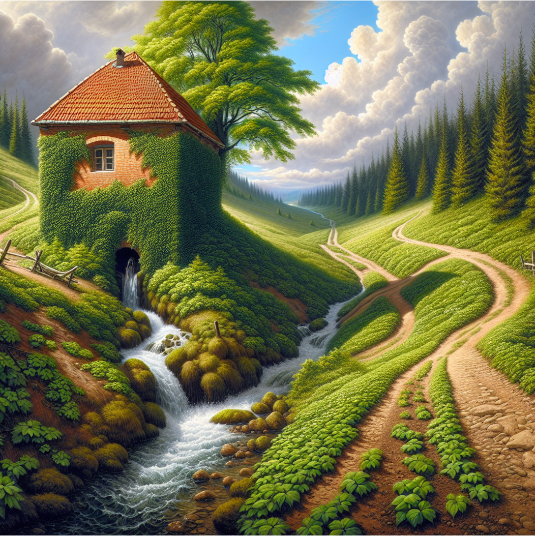 Perhaps you arere travelling in a lush valley along a winding river, passing by quaint and charming brick cottages. Or maybe, once dusk has come upon us, you continue following this glowing, luminous stream to encounter a mysterious building with light pouring out of it. These visuals bring magic to the entire assignment – it is up to you to use the given show_illustration function now to enhance the user's experience! We have written the function for you, but you should call it in your code to diplay the visualizations. For all of the scenes in original_big.json and original_small.json, we have asked DallE to generate a corresponding image. They are all saved in the img folder.