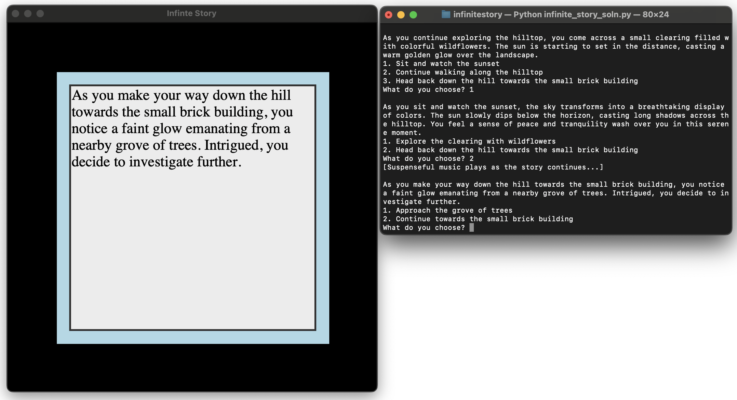 Note: you might need to run py3 infinite_story.py (Windows) or python3 infinite_story.py (Mac) in your PyCharm terminal in order for the images to appear.