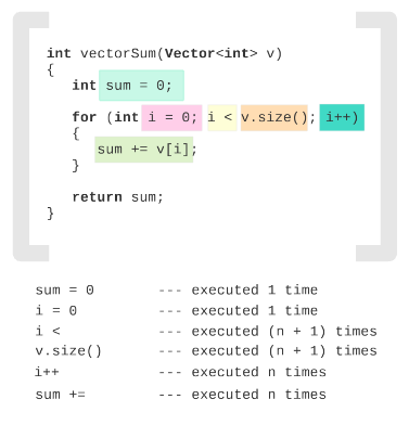- It's easy to miss operations! For example, in the code above, the i++ and sum += operations are both doing an assignment and an arithmetic operation, so they should have been counted twice. The v[i] read has a hidden multiplication operation related to memory addresses. The return statement actually moves a value into a register in memory and might have to count as an assignment statement, as well. This is getting tedious and unruly, and the whole process of counting operations seems susceptible to human error.