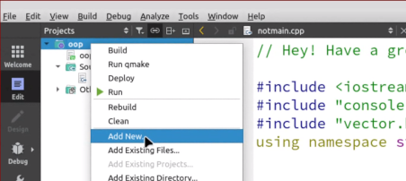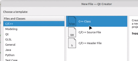 In the menu that popped up, I selected "C++ Class." We can see from the icon in that option that we're going to get both a .h file and a .cpp file. Neat! That's what we want. We'll have a place for our class's interface and a place for its implementation.