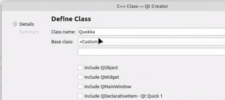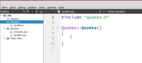 When we finished, Qt Creator added two files to our project: quokka.h and quokka.cpp: