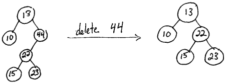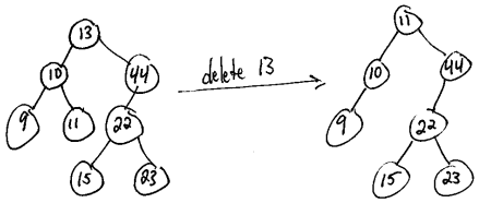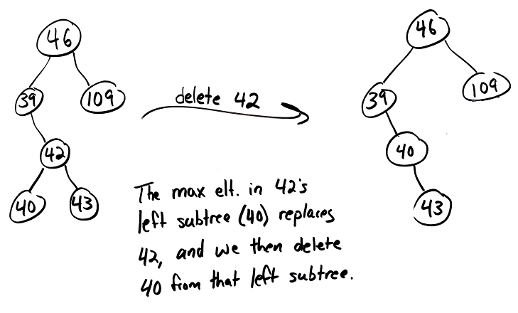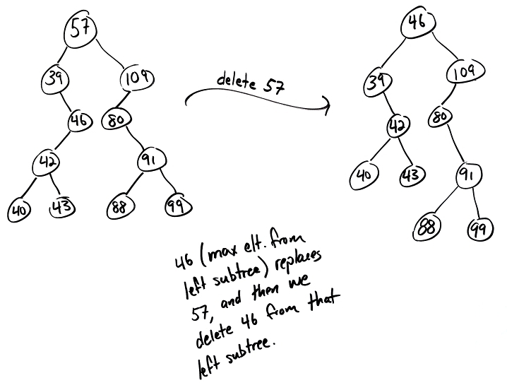 Alternatively, if we delete a node that has two children, we could replace the node's value with the minimum value from its right subtree (and then delete that min element from the right subtree). However, for the sake of keeping everything consistent and easy to grade on exams in this class, I always want you to choose option shown in class: use the maximum element from the node's left subtree.