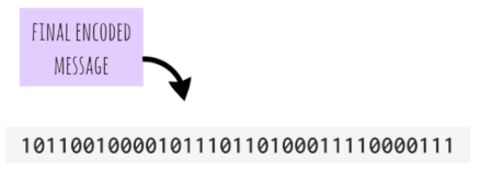 Given the starting sequence 01000101..., do the two bits 01 go together or the three bits 010 or perhaps just the first bit 0? If you look at the encoding table above, you will see that only one of these options is possible. There is no character that encodes to the single bit 0 and no character that encodes to the sequence 010 or 0100 or 01000 for that matter. There is, however, a character that encodes to 01 and that is h.