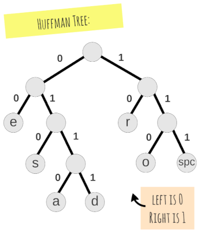 Here is a tree for the variable-length Huffman encoding we used earlier: