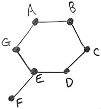The file above represents graph G1 from today's notes. The first line tells us how many nodes there are in the graph, n, which allows us to create an appropriately sized grid to store our adjacency matrix. The next n lines give labels or names to our nodes. Those can be stored in a vector for ease of reference. The final n lines give us an adjacency matrix. The first of those final n lines tells us which nodes have an edge from vertex A (where 0 indicates no edge, and 1 indicates an edge). Within that line, the pattern 0 1 0 0 0 0 1 indicates the following: