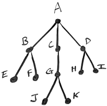The breadth and depth metaphors perhaps make more intuitive sense when we consider BFS and DFS traversals of a tree. (Recall that a tree is a graph, so I'm not doing anything unconventional or weird by performing BFS or DFS traversal on one.) Consider, for example, the following graph, G2:
