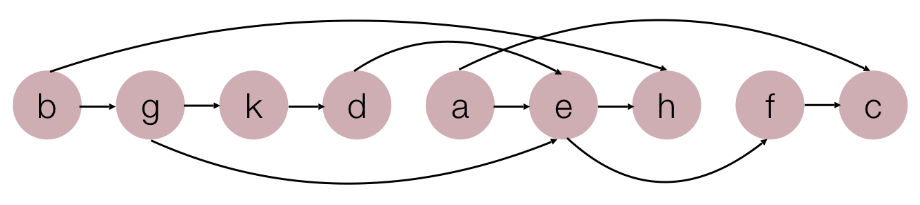 For example, in the graph below, node h has two incoming edges: one from b, and one from e. Accordingly, any valid topological sort for this graph must list nodes b and e before listing node h: