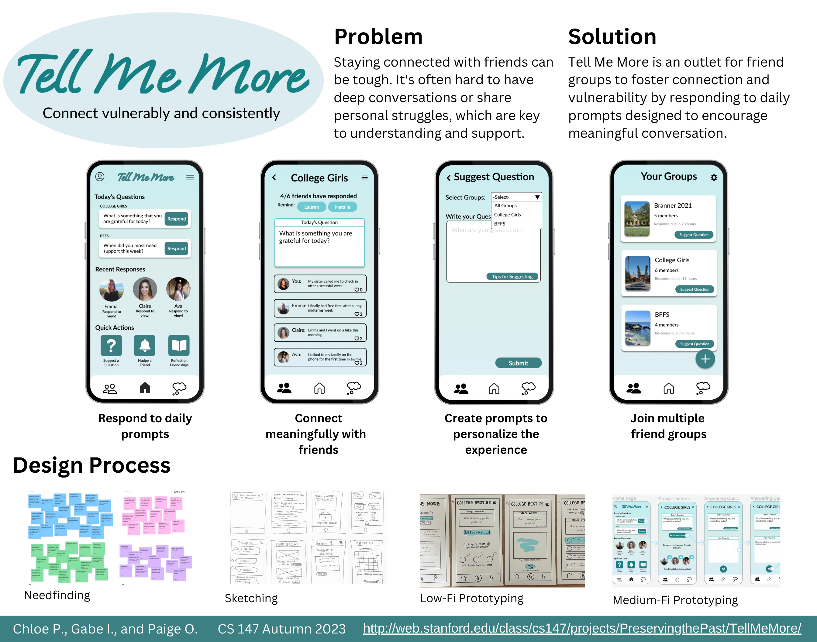Staying connected with friends can be tough. It's often hard to have deep conversations or share personal struggles, which are key to understanding and support. Tell Me More is an outlet for friend groups to foster connection and vulnerability by responding to daily prompts designed to encourage meaningful conversation.