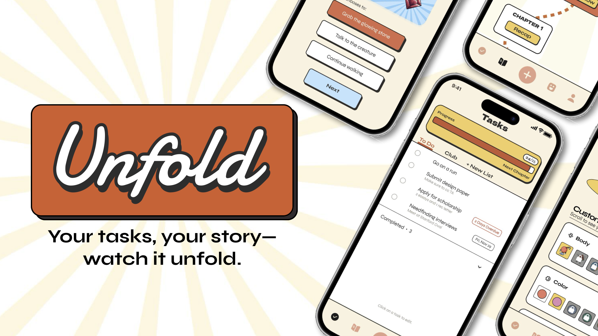 This poster showcases our CS 147 journey, starting with the needfinding stages and ending with the high-fi prototype. We presented Unfold to over 300 people at the CS 147 Project Expo on Friday, December 6th from 6 - 9pm.