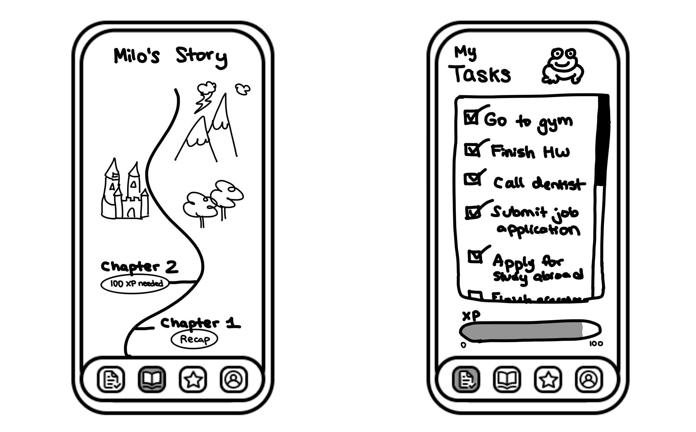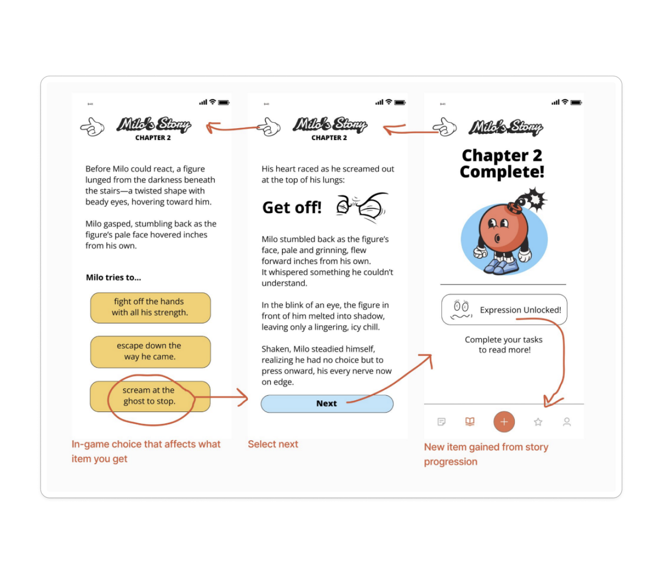 These are the medium-fi prototypes of our three main tasks users can perform in our app. The simple task is to enter and complete one of your tasks. The moderate task is to choose an in-game option to advance your story. And the complex task is to personalize your story theme and character.