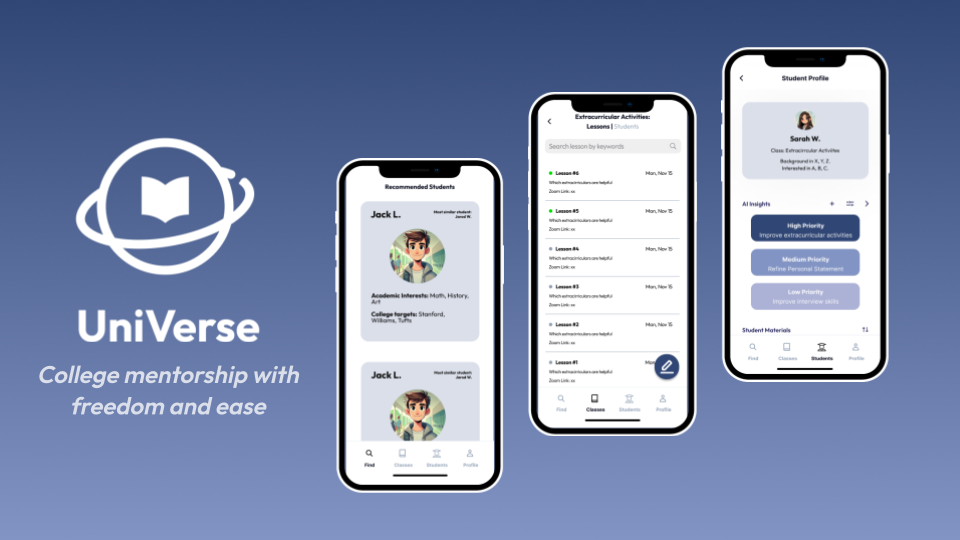 UniVerse, developed by Stanford students, revolutionizes college counseling by breaking away from the rigid, traditional structure of existing services that often emphasize "traditional" target schools like Ivy Leagues. The app fosters peer-to-peer connections and empowers counselors with the freedom to craft their own unique advice, providing students with personalized, diverse insights and opening up a broader range of opportunities.