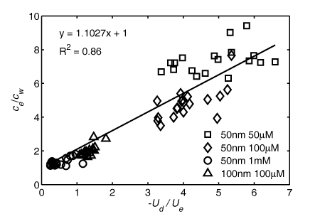 Figure 4. Background electrolyte enrichment factor versus enrichment to depletion shock velocity ratio. The solid line is a least squares best fit line with a fixed y-intercept of 1. We measured shock velocities and enrichment region concentration for 70+ realizations, varying the concentration of Alexa Fluor 488 and the nanochannel height.
