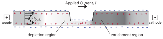 Ionic current in nanochannels is dominated by counter-ions to the wall charge (positive ions for a negatively charged wall). When a negatively charged nanochannel is placed in series with a microchannel, this ionic flux imbalance leads to a net neutral increase in ionic strength on the cathode side and a decrease in ionic strength on the anode side (Figure 1). This phenomenon is called concentration polarization (CP). We have performed a detailed analytical, experimental and computational study of CP in a microfluidic system. Figure 2 shows a movie of a sample computational result. Figure 3 shows a simulation result and an experimental result side-by-side. Our simulation shows excellent agreement with experiments using nanochannel wall charge as the only fitting parameter.