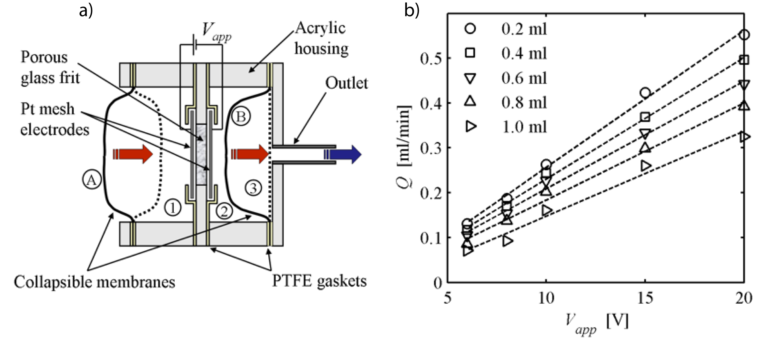 Figure 1: Adapted from Litster et al9 (a) Schematic of the two-liquid EO pump. Two collapsible membranes actuate the drug delivery. Working electrolyte is pumped from reservoir 1 to reservoir 2 by electroosmosis. Membrane B displacement drives the liquid in reservoir 3 through the outlet. (b) The flow rate of the liquid pumped from reservoir 3 as a function of applied voltage. Flow rate is plotted at times when the fully charged device has pumped 0.2, 0.4, 0.6, 0.8, and 1.0 ml from reservoir 3.
