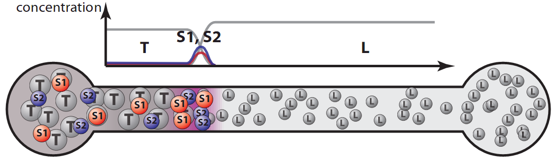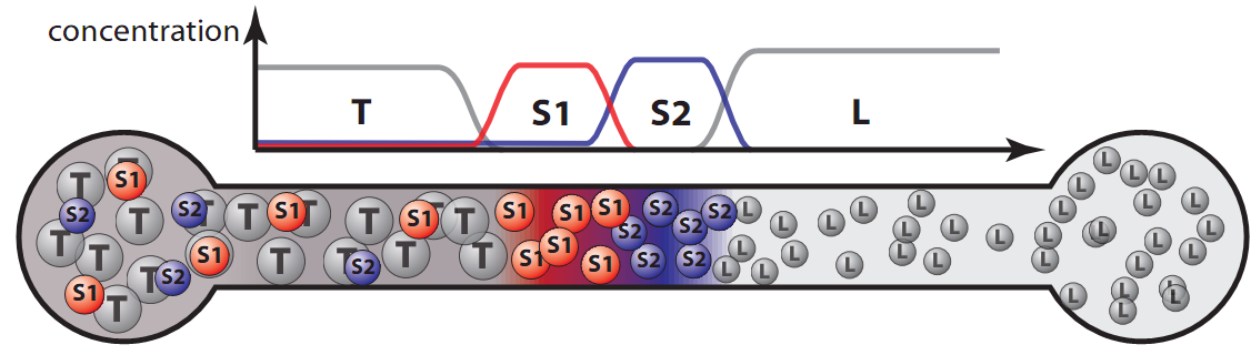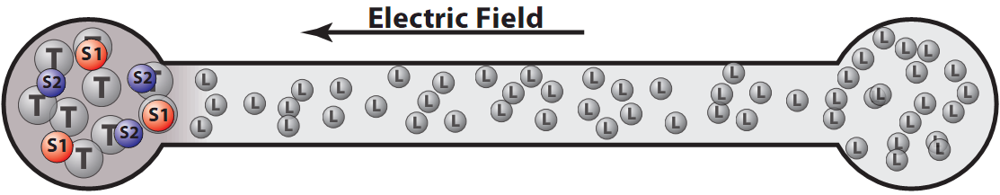 We fill one well with slow trailing electrolyte (T) mixed with samples (S1,S2), and the other well with fast leading electrolyte (L). When we apply an electric field, ions electromigrate through a microchannel according to their electrophoretic mobilities.