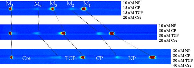 Figure 4. IMMA microdevice results: Simultaneous preconcentration, separation, and detection of four toxins: 2-Nitrophenol (NP), 2-Chlorophenol (CP), Trichlorophenol (TCP), and p-Cresol (Cre). All of these have fully-ionized mobilities which are within ~10%, but careful selection of assay pH helps leverage their differing pKa values for high resolution and specificity. The markers here are Alexa Fluor 488, Oregon Green Carboxylic Acid, Fluorescein, Bodipy, and Green Fluorescent Protein (M1 through M5, respectively). Note the quantitative relationship between signal gap width and analyte concentration (e.g., note the effect of doubling CP from the first to the second image). Note the high/low/high signal intensity (digital encoding) scheme which we have integrated into the assay for unambiguous identification of analyte and marker zones.