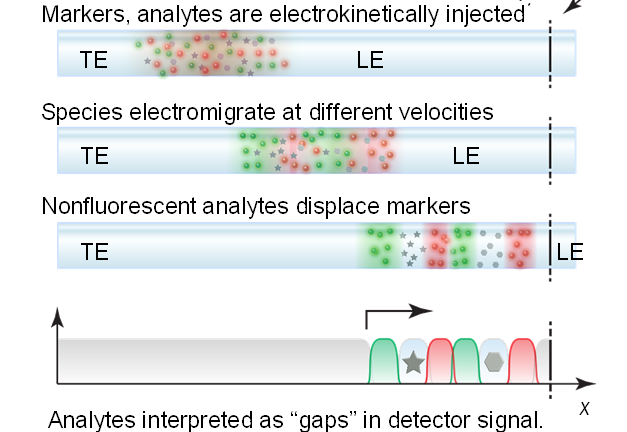 Figure 1. Schematic of our ITP/mobility marker assay for injection, pre-concentration, separation, and indirect fluorescence detection of unlabeled analytes.
