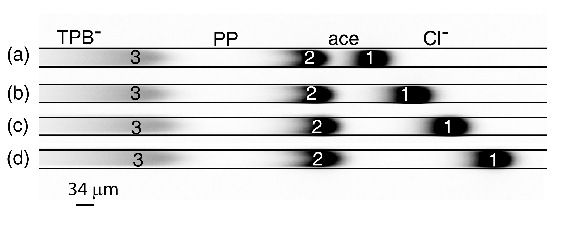 Figure 2. CCD images of the fluorescent mobility markers in a 30 um microchannel demonstrating separation of acetate (Ace-) and phenylpropionate (PP) ions in four different experiments. The initial concentration of Ace- is increased linearly from 12 µM to 48 µM in (a)-(d) resulting in a linear increase in the spacing between fluorescent marker peaks 1 and 2. PP concentration is held constant at 40 µM. 1: OGCA, 2: Fluorescein, 3: Bodipy