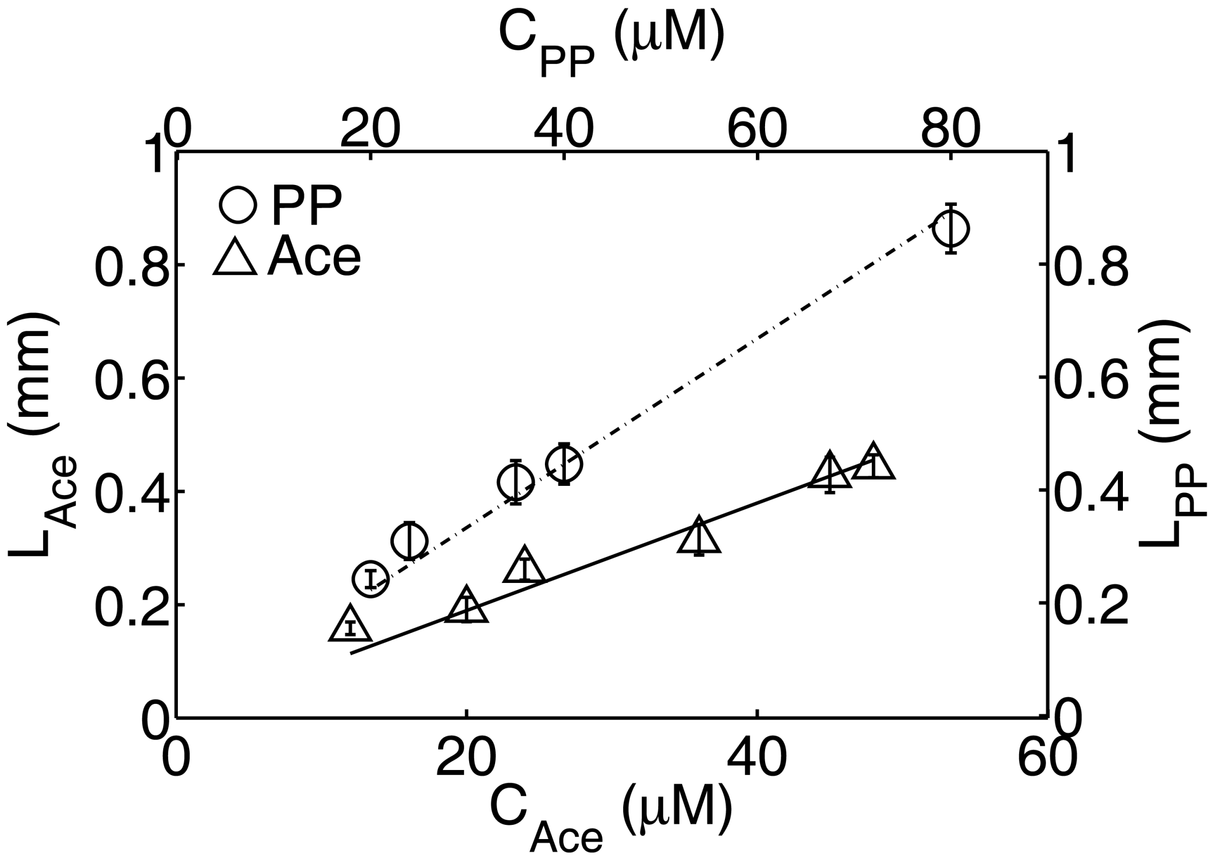 Figure 3. Length of the acetate and phenylpropionate analyte zones as a function of their initial concentrations for the low LE concentration experiment. Solid line is a linear fit to the experimental data with regression coefficient of 0.98, and the dashed line is the theoretical prediction of LAceandLPP. LE was 5 mM Tris-HCl and TE was 5 mM sodium tetraphenylborate