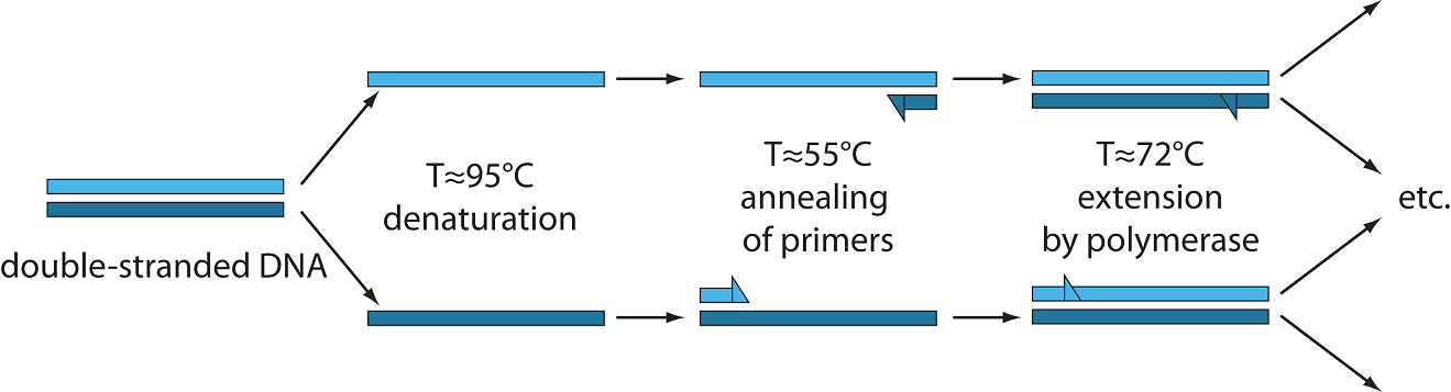 In classical PCR, double stranded DNA (dsDNA) experiences a three-step thermal cycle illustrated in figure 1. The first step, denaturation at ~ 95°C, disrupts all hydrogen bonds between the two strands of the template, creating two complementary free strands of DNA. The second step, annealing at ~ 55°C, allows specific binding of primers to the parent single-stranded DNA (ssDNA). Primers are specifically designed short ssDNA that are complementary to the 5’ ends flanking the sequence of interest. Finally, in the extension step at ~ 72°C, a DNA polymerase binds to the priming sites and elongates the primer. Ideally, after each cycle, the number of DNA copies in the reactor doubles.