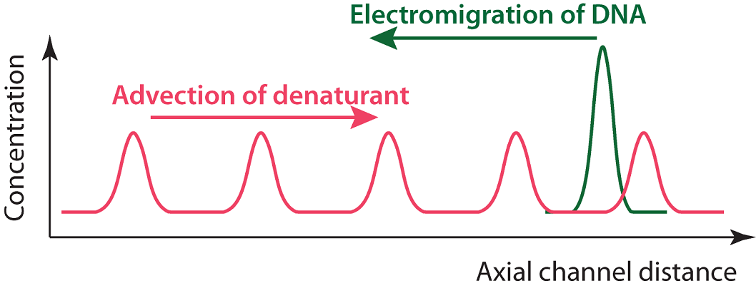 Figure 2: Conceptual representation of ccPCR. Zones of high denaturant concentration flow in opposite direction of DNA template electromigration. The template experiences a chemical cycling that mimics the thermal cycling of classical PCR. |