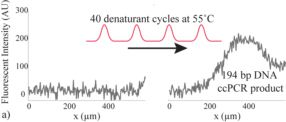 The polymerase chain reaction (PCR) is a ubiquitous platform in biological and medical assays. PCR can amplify a specific DNA sequence with high sensitivity (single copy). In particular, it is commonly used for identification of DNA, RNA (with initial reverse transcription, RTPCR) and also quantification (quantitative PCR, qPCR) of nucleic acids. Examples of applications are: diagnosis of hereditary disease, forensics, gene expression profiling, pathogen detection, etc.