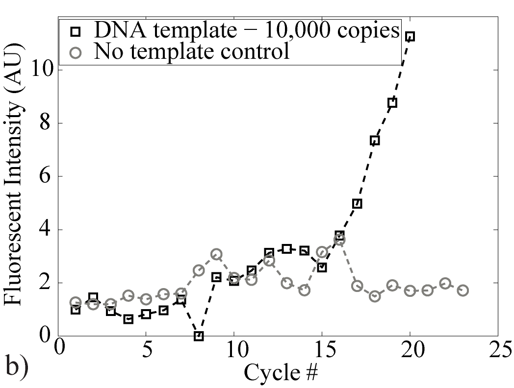 Figure 4: Experimental results of the ccPCR. (a) Isotachopherograms of PCR product zone before (left) and after 40 ccPCR cycles (right). This type of end point detection allows identification of DNA sequence of interest. (b) Real time fluorescence monitoring of ccPCR. Initially, the PCR product fluorescence signal is below limit of detection. Here, the fluorescent signal rises above background at cycle 18. |