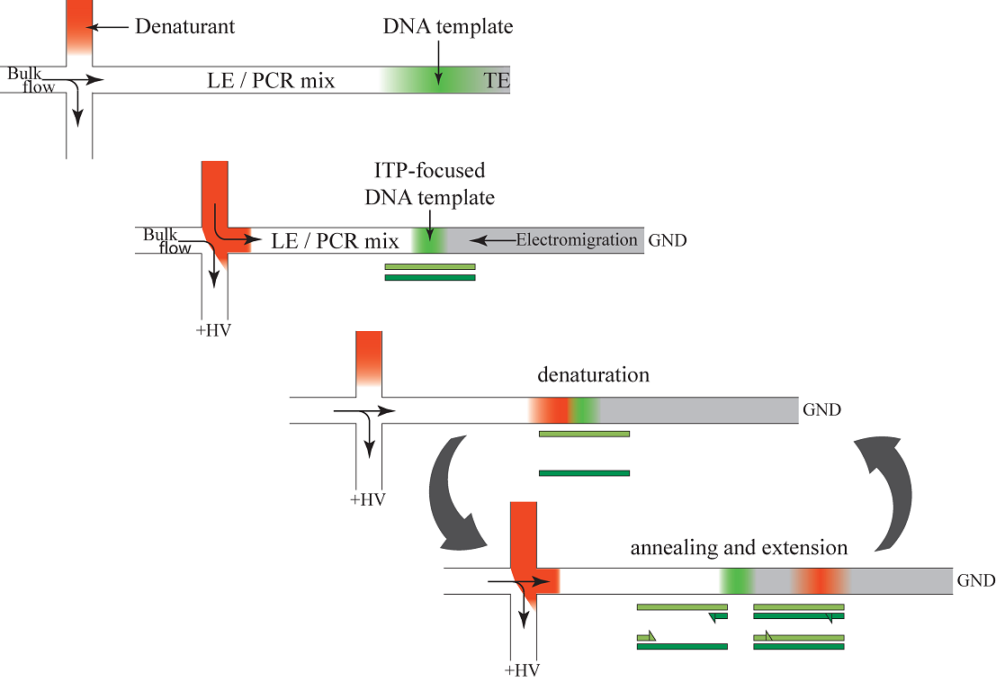 Figure 3: Schematic of the ccPCR. (a) DNA template (green) is initially injected between LE and TE. (b)Upon application of an electric field, DNA focuses between TE and LE with ITP. Upon balance of flow and electromigration velocities, DNA is stationary in the microchannel. A precise flow control scheme at the cross creates discrete pulses of denaturant. (c) DNA experiences a high denaturant concentration and denatures. (d) DNA anneals a primer which is then extended by a polymerase. |