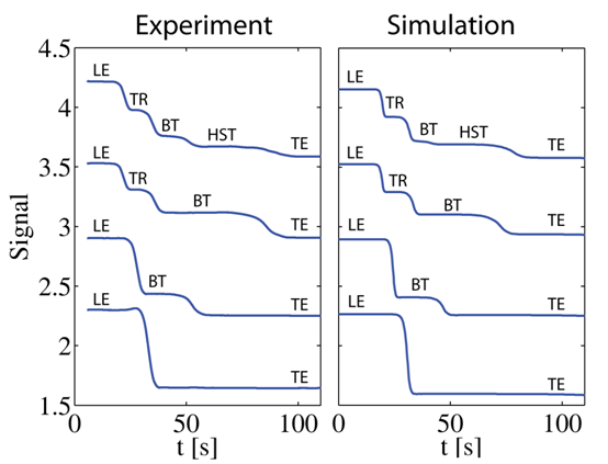 Figure 2: Demonstration of separation and NFT-based indirect detection of three model analytes using the hand-held device. The right-hand column presents simulation results (using our Spresso simulation tool) and the left-hand column present experimental results. Both plots show detectable zones of bistris (BT), tris (TR) and histidine (HST) focused between LE (sodium-Bes)and TE (pyridine-Bes). Mixing of an additional species with TE results in a new ¿step¿ in the fluorescence signal.